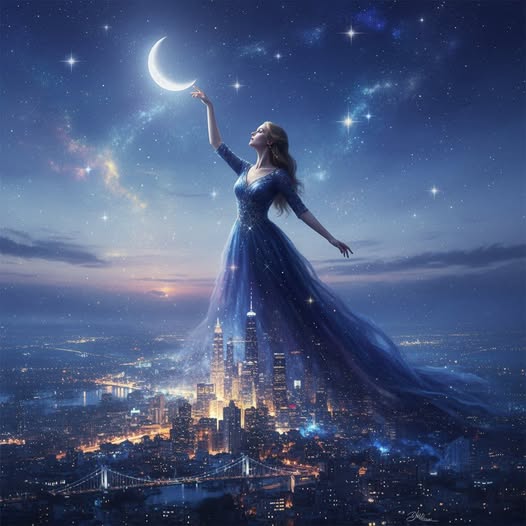 In the enchanting realm of AI art, “Celestial Embrace” captures a moment where the city and the night intertwine, evoking the poetic imagery of stars becoming the horizon. This artwork presents a woman adorned in a flowing gown, sparkling with glowing fragments that seem to dance with the night sky. Her hand reaches towards a crescent shape suspended in a twilight horizon, blending seamlessly with the illuminated skyline. The surreal composition evokes a dreamlike atmosphere, where ethereal textures meet painterly aesthetics. The soft haze and diffuse glow create a cinematic view, inviting viewers to lose themselves in the deep indigo and violet tones, reminiscent of a starry night. As shimmering particles scatter like stardust, this artwork beautifully unites celestial grace with the vibrant pulse of a city. Engage with AI-generated visuals that breathe life into poetic prompts, transforming dreams into stunning digital masterpieces. Explore the intersection of technology and creativity, and discover how AI art reshapes our perception of beauty and imagination.