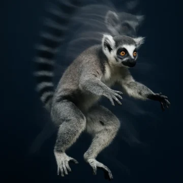 Studio portrait of a lemur jumping. The image
