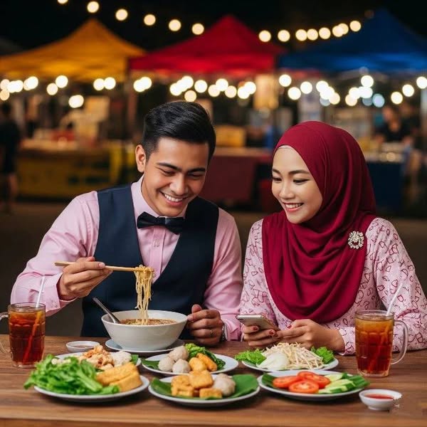 PROMPT : Pasangan muda Asia 25 tahun yang sedang duduk berdampingan di meja kayu di sebuah pasar malam yang ramai, menikmati makan malam bersama. Pria mengenakan kemeja merah muda, Jas Hitam, dasi kupu-kupu putih, rambut pendek rapi hitam, tersenyum bahagia sambil memegang sumpit dan menarik mie dari tempat besar mie kuah panas, sementara wanita hijab merah tua panjang dengan motif bermerek ujung jilbab dihiasi dengan Bros kecil dengan pakaian muslimah merah muda panjang sangat anggun dan anggun cantik aksen putih, tersenyum bahagia sambil memegang ponsel dan melihat layar bersama pasangannya. Meja penuh dengan makanan tradisional seperti sayur segar, bakso, tahu goreng, irisan tomat, dan dua gelas besar minuman teh es berembun. Latar belakang dipenuhi lampu hangat yang menggantung, suasana malam cerah dengan tenda warna-warni dan banyak orang berlalu-lalang, menciptakan suasana pasar malam Asia Tenggara yang hidup dan autentik. Fokus sangat tajam pada pasangan wajah dan detail makanan, pencahayaan lembut namun terang, warna-warna hangat dan realistis, kualitas foto ultra-realistis, tidak blur, pencahayaan alami malam hari dengan bokeh latar belakang yang halus…..#GeminiAI